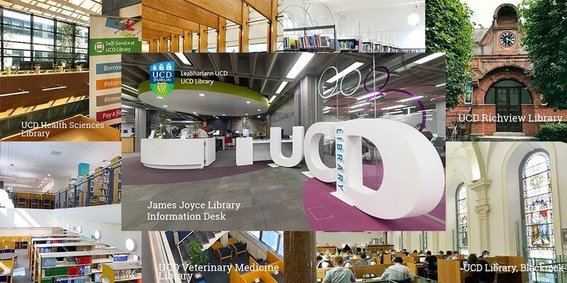 校内共设有五座图书馆,为员工提供丰富的学术资源及学习空间,包括:全爱尔兰最大的综合性图书馆、最大的商科类别图书馆、爱尔兰唯一的兽医学图书馆以及建筑、景观设计及城市规划图书馆。